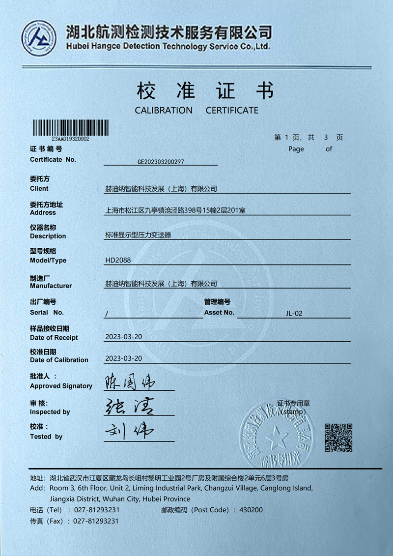 标准显示型压力变送器校准证书